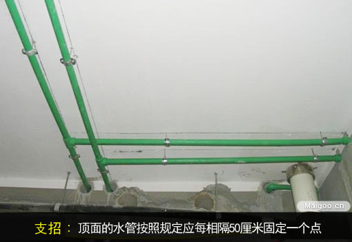 PPR水管在頂面上必須固定,按規(guī)定,應(yīng)每相隔50厘米固定一個(gè)點(diǎn)。而且要注意,管道不能與點(diǎn)燈等會(huì)發(fā)熱的電器靠的太近,以免被烤化。而且,施工前應(yīng)確保樓上住戶衛(wèi)生間的閉水驗(yàn)收合格。