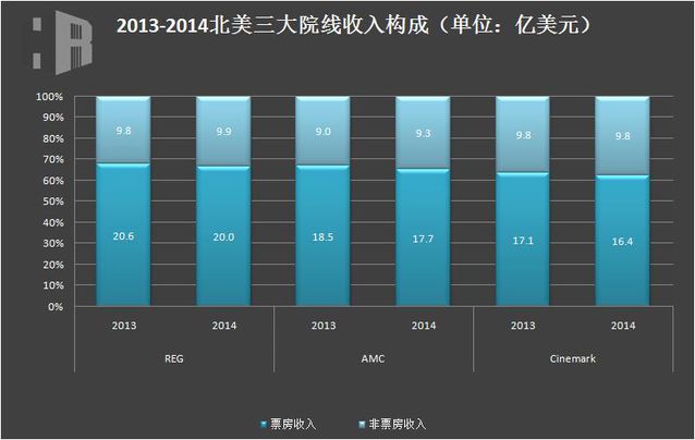根據(jù)華誼兄弟研究院此前的一項(xiàng)研究,北美三大院線近兩年的票房收入占比平均數(shù)為65.6%,非票房收入占比為34.4%。萬(wàn)達(dá)院線在非票房收入方面與北美的前輩們相比,雖仍有距離,但與國(guó)內(nèi)同行比起來(lái)足可算得上是先進(jìn)代表了。