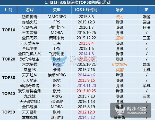 (僅統(tǒng)計(jì)2016年1月31日App Store當(dāng)天暢銷榜,騰訊發(fā)行游戲排名)