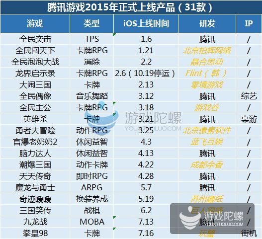 2015年騰訊發(fā)行的重點(diǎn)產(chǎn)品已經(jīng)集中在了重度類型,當(dāng)然騰訊內(nèi)部的分類沒有輕、中、重,而是按類型分,以這個(gè)標(biāo)準(zhǔn)看:卡牌、休閑、MOBA、FPS四類為主。IP類產(chǎn)品在騰訊2015的手游中表現(xiàn)十分突出。但顯然騰訊還有大量的IP產(chǎn)品和來自合作CP的產(chǎn)品。
