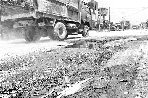 不時(shí)有工程車輛駛過,整條路路面坑坑洼洼,十分不平整